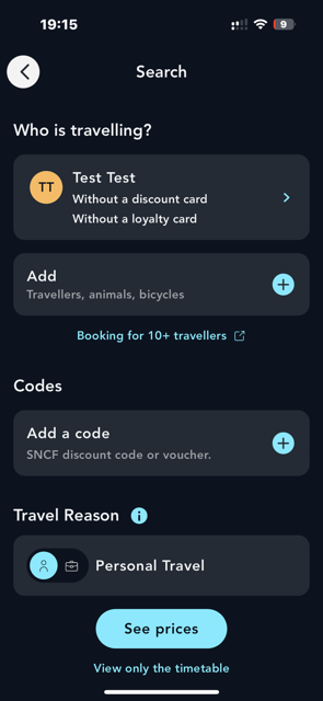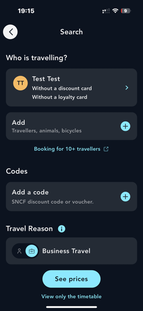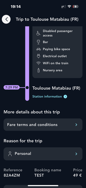 The declaration of the reason for travel can be made during the booking (on the search page) or after the booking (on the Tickets page). This allows you to classify your travels for simplified and organized management.