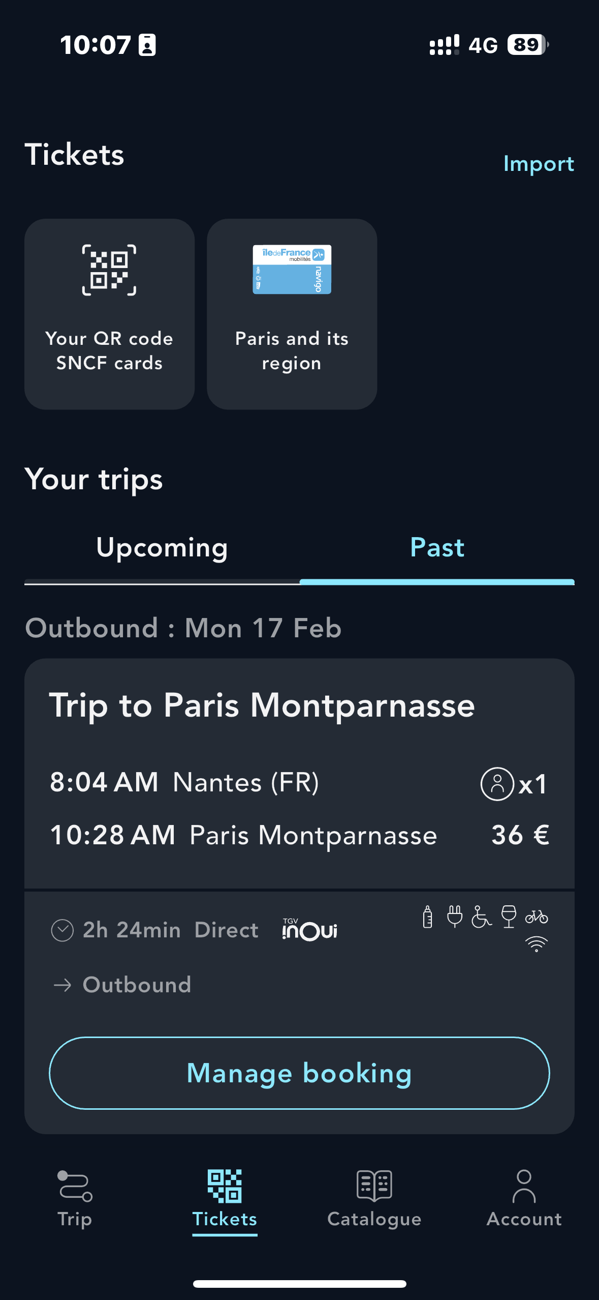 From the 'Your past journeys' tab, click on the 'Manage booking' button