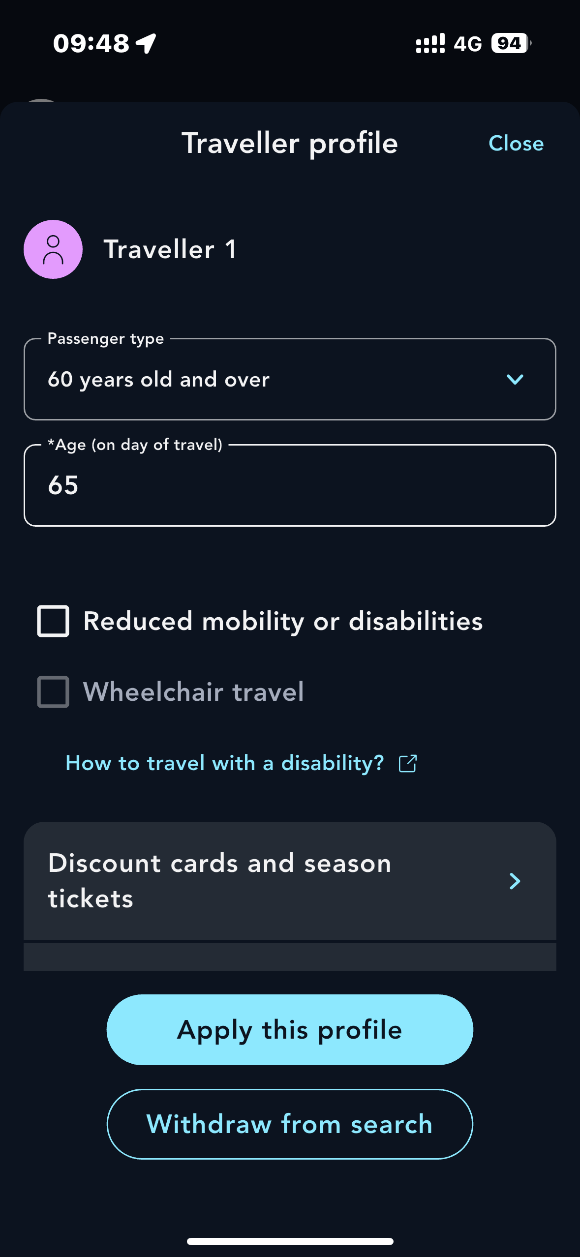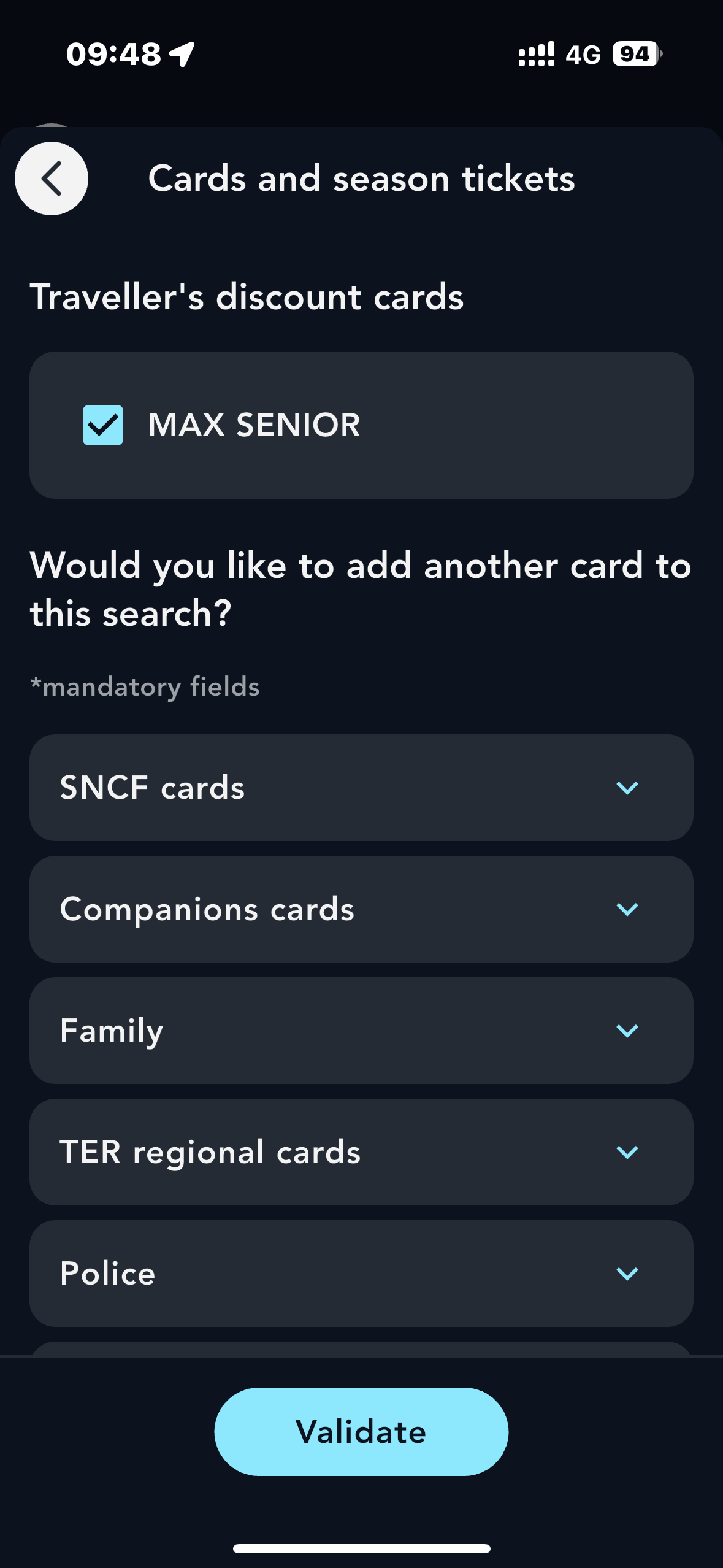 Select the age group (60 and over) in the Passenger 1 menu, then enter your age and finally the corresponding MAX SENIOR subscription