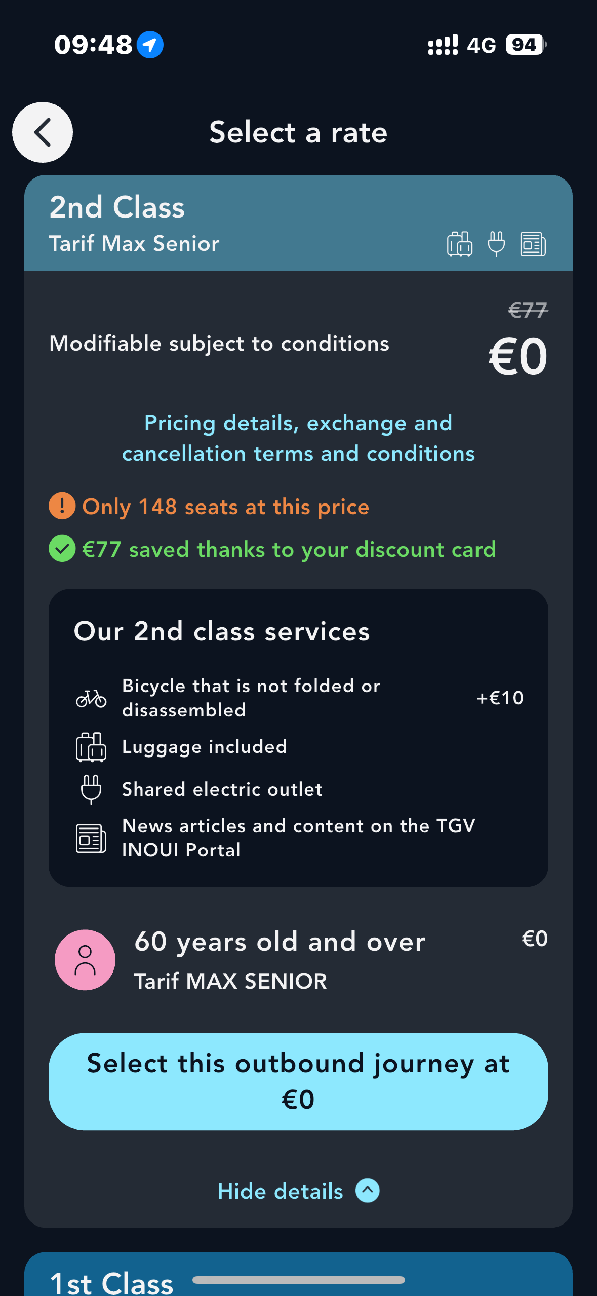 In addition to MAX SENIOR tickets at €0, you can benefit from the MAX AVANTAGE SENIOR fare and get a 30% discount on TGV INOUI and INTERCITÉS trains with compulsory booking in 1st and 2nd class, on all trains open to booking.