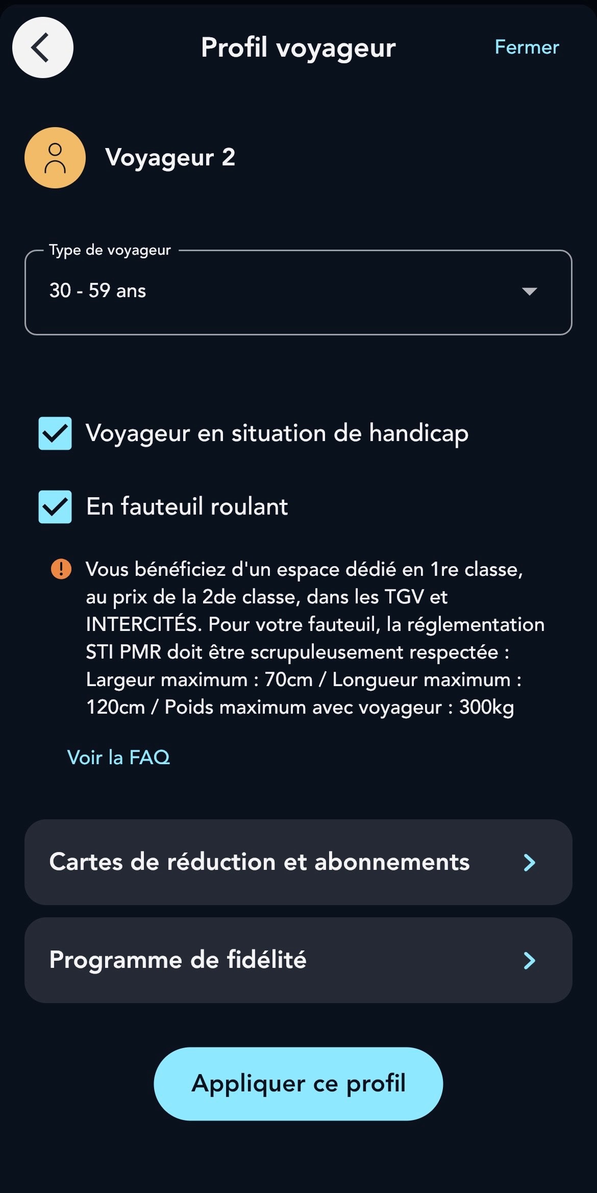 Cochez la case "Voyageur en situation de handicap", et si applicable, la case "En fauteuil roulant"*