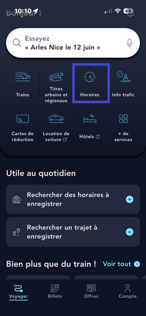 Appuyez sur « Horaires » sur la page d'accueil de l'application