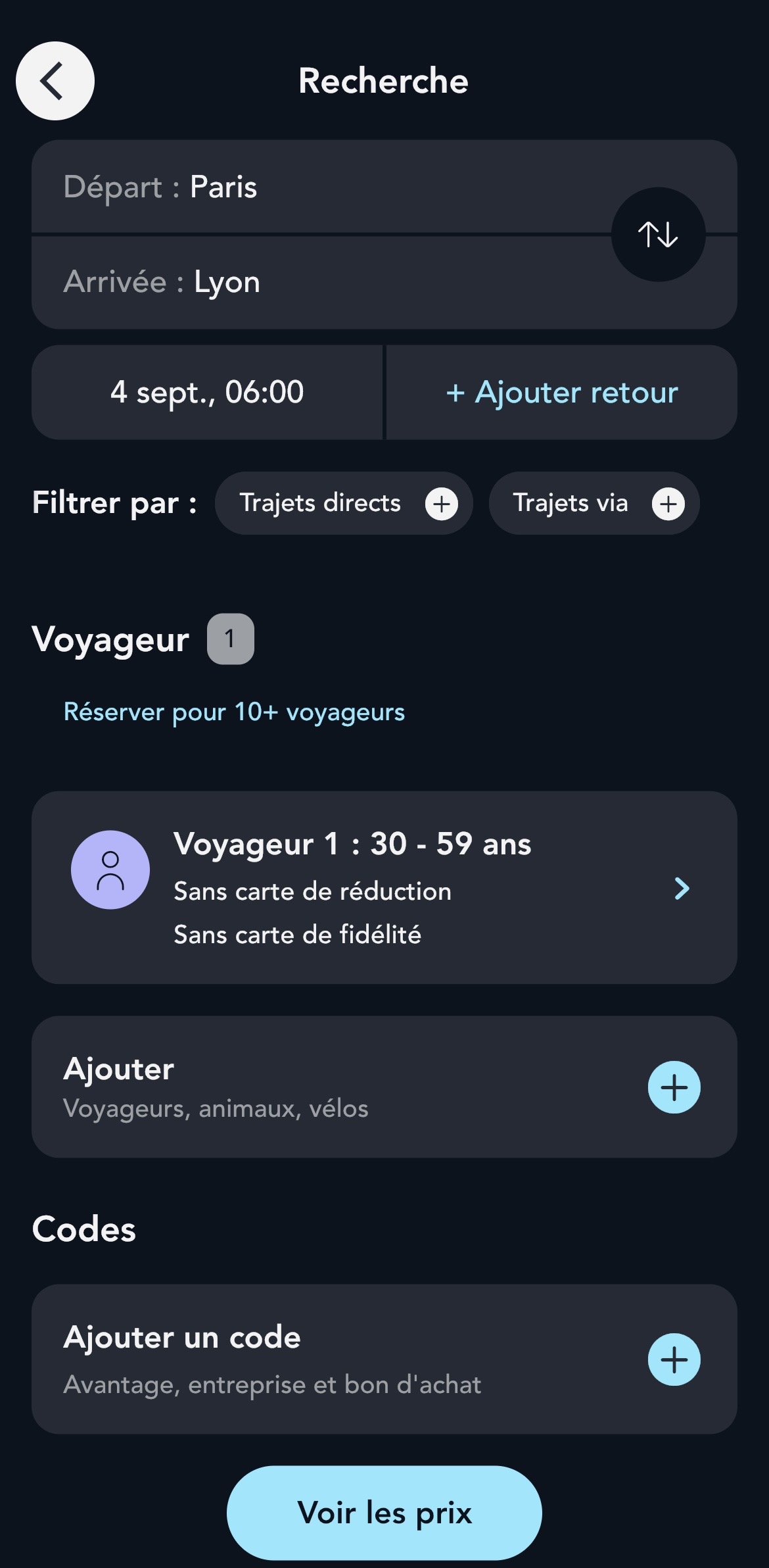 Voici comment renseigner les codes de réduction pour plusieurs voyageurs sur le formulaire de recherche :