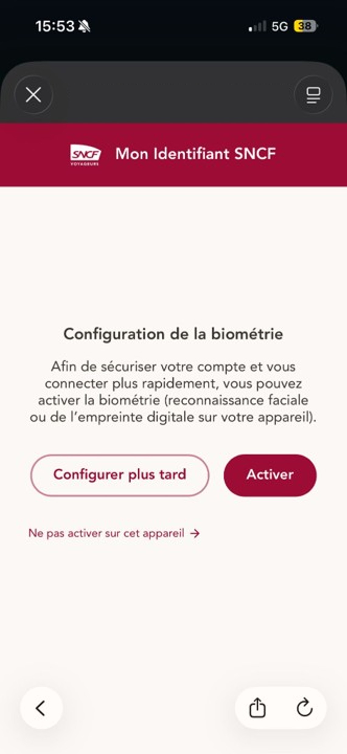 Depuis le 14 janvier 2026, l'authentification via la biométrie vous est proposée afin d'améliorer votre expérience et de renforcer la sécurité de vos données.Pour une connexion plus rapide et plus sure, vous pouvez choisir si vous le souhaitez d'activer la reconnaissance faciale ou digitale en fonction de la compatibilité de votre téléphone ou ordinateur.Cette évolution a entrainé la déconnexion automatique à votre compte. Pour accéder à vos informations de voyage et à vos billets, il vous suffit de vous reconnecter avec vos identifiants habituels en saisissant votre e-mail, votre mot de passe et le code de vérification envoyé sur votre adresse e-mail puis de vous laisser guider pour activer la biométrie.Une fois la biométrie configurée, vous n'aurez plus besoin de saisir votre mot de passe ou le code de vérification à 6 chiffres envoyé par e-mail pour vous connecter.